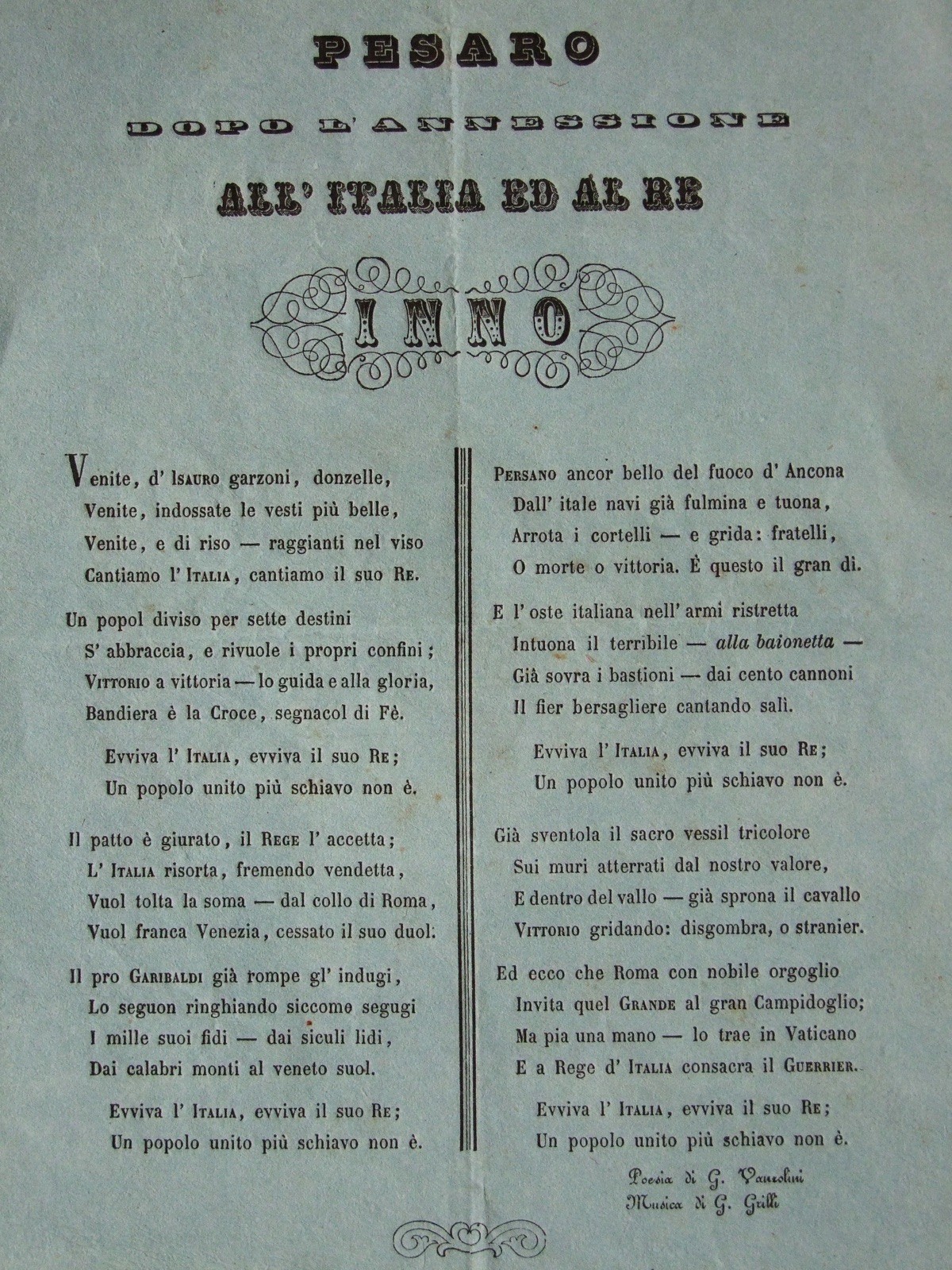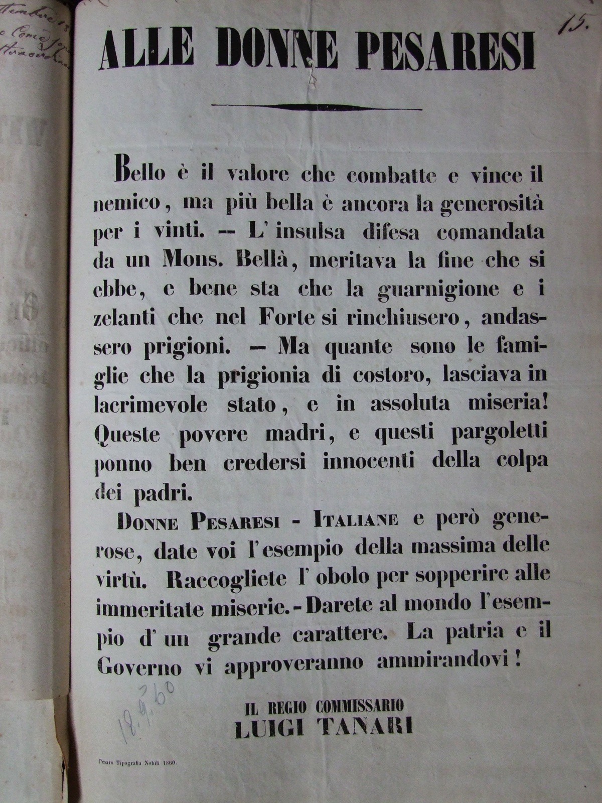 E interessante anche l’avviso che esorta i pesaresi a starsene in casa e ignorare l’arrivo in città di Monsignor Lamoriciere, “ uomo senza carattere e vituperevole”. Dopo tre giorni di attacchi, i piemontesi hanno la meglio e le truppe pontificie si arrendono. Il generale Cialdini entra in città.