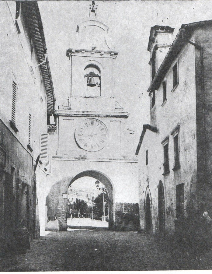 La porta dell’orologio era una delle due dell’antico castello. Subito dopo la porta, al posto dell’attuale farmacia c’era l’unica chiesa del castello, la chiesa di san Pietro.  La chiesa era a navata unica, di piccole dimensioni, con un campanile a vela. Nell’altare maggiore vi era il dipinto raffigurante San Pietro, attribuito al pittore seicentesco Giovan Battista Urbinelli, nato a Fermignano nel 1605 e deceduto nel 1663.