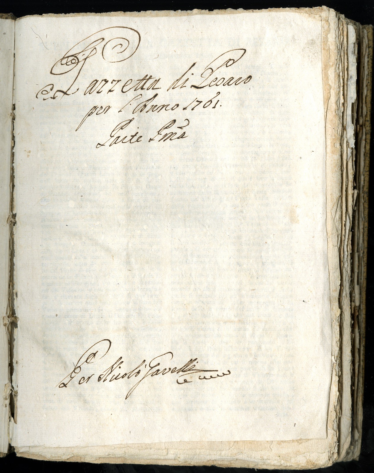 Nel lavoro culturale della tipografia e libreria di Niccolò Gavelli rientrava l’impegno per la redazione del primo giornale di Pesaro, “La Gazzetta di Pesaro”, con notizie reperite, possiamo immaginare, con grande fatica. Naturalmente non si trattava di un quotidiano, ma di un settimanale, che usciva ogni martedi.