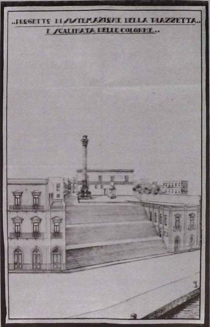 L’area della piazzetta, dopo essere stata abbandonata per molto tempo, in modo non dissimile a tutta la città di Brindisi che pullulava di rovine di epoca antica, nel 1931 è stata risistemata e resa monumentale con l’allargamento della scalinata dedicata a Virgilio e la costruzione della Palazzina del Belvedere, oggi sede della Collezione Archeologica Faldetta. Una leggenda inventata dai cronisti brindisini, per nobilitare la città, identifica negli edifici prospicenti sulla piazzetta la casa di Virgilio. La notizia non è in nessun modo documentata, mentre è vero che Virgilio, di ritorno a Brindisi dalla Grecia, morì a Brindisi nel 19 a.C. Una iscrizione ricorda il grande poeta latino.
