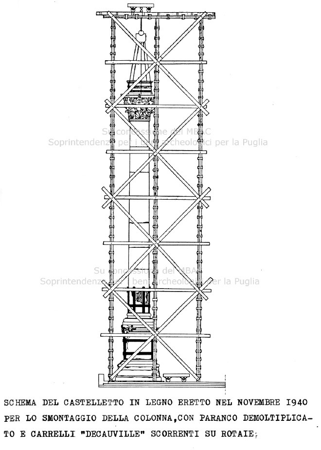 Nel 1528 una delle due colonne rovinò per terra e i rocchi rimasero per 132 anni sul pavimento fino al momento in cui, nel 1659, furono concessi alla città di Lecce per devozione di Sant’Oronzo, il potente santo (così potente da essere subentrato a Sant’Irene come patrono di Lecce) che aveva salvato il Salento dalla peste. La colonna fu trasportata a Lecce con molte difficoltà a causa delle pessime condizioni delle strade. A Lecce il capitello fu modificato in forme barocche da Giuseppe Zimbalo dal 1666 ospita la statua di Sant’Oronzo sulla sommità.