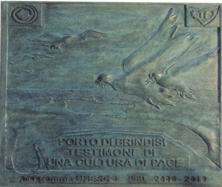 Ai piedi delle colonne è esposta la targa in bronzo realizzata dallo scultore brindisino Giuseppe Marzano, che ricorda il riconoscimento UNESCO del 2010 al porto di Brindisi “Monumento Testimone di una Cultura di Pace per l'Umanità”.