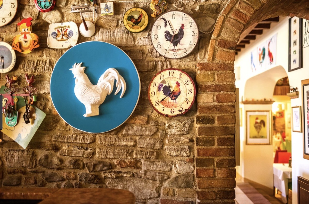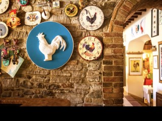 La locanda offriva ristoro a viandanti e contadini, commercianti di passaggio e giocatori di “briscola e tresette”. Il vino spillato dalla botte e i piatti della tradizione cucinati con i soli prodotti locali, insieme alla maestria dei proprietari sancivano l’inizio di una lunga storia di ospitalità. Dentro la locanda Ciacci (ricco di memorie del grafico Massimo Dolcini) è pieno di galli (ceramiche, disegni, dipinti, etc.).