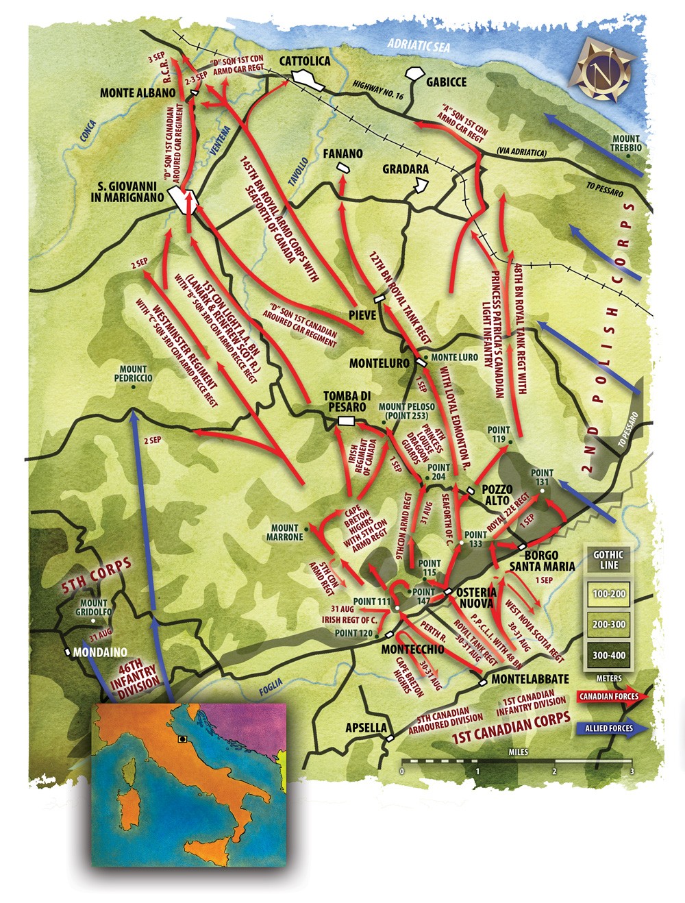 A Pozzo Alto, sulle colline, sulla dorsale del fiume Foglia, c’è un vecchio pozzo. Nella campagna attorno hanno marciato i soldati Alleati. Il Monumento ai Caduti Canadesi Quota 204 si affaccia su un paesaggio di intatta bellezza. La dorsale è stata sempre un luogo di conflitto: fra Malatesta e Montefeltro e in tempi più recenti fra i soldati i tedeschi e le forze alleate dell’impero britannico.