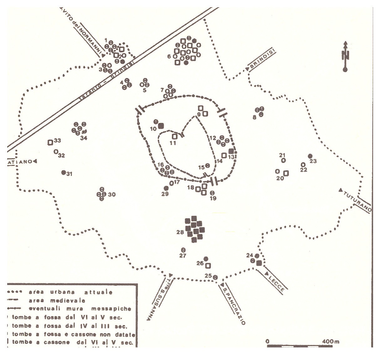 Da questa posizione è possibile anche osservare un aspetto rilevante del centro storico della città: la formazione sopraelevata rispetto alla pianura circostante del centro storico, una sorta di acropoli, ricca d’acqua e ben difendibile che fece scegliere, nella tarda età del ferro al popolo Japigio, questo territorio come luogo di insediamento, di cui si trovano i resti nella necropoli di vico Quercia.
