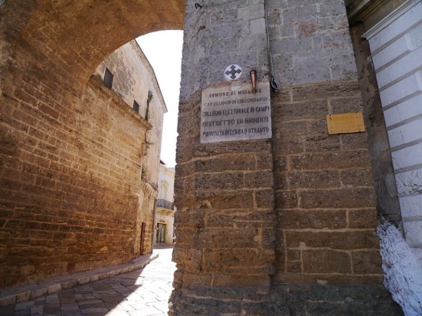 All’esterno l’epigrafe che ricorda che Mesagne, dopo la riorganizzazione napoleonica, fu capoluogo del circondario di Brindisi nella provincia di Terra d’Otranto, insieme a Lecce e Taranto, prima di essere sostituita da Brindisi nel 1816.