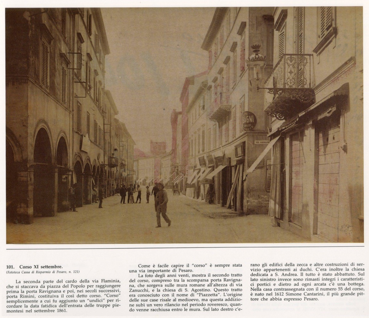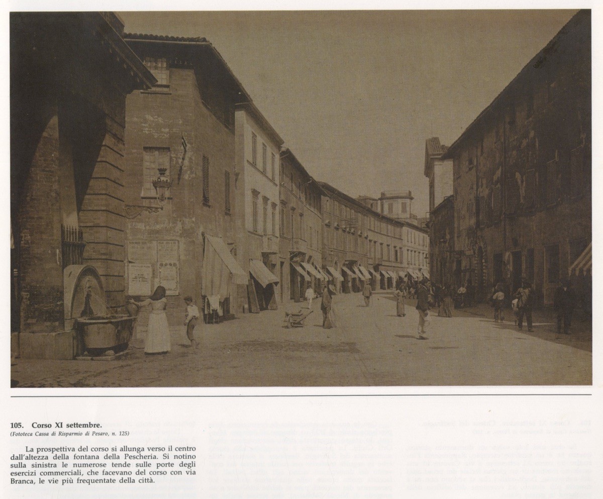 Nonostante l’aspetto animato del Corso, anche Carlo Cinelli nel 1880  descrive Pesaro come una città dall’aspetto triste e monotono con molte case cadenti di ‘epoca gotica’ con “le finestre e porte ad arco acuto e coi muri e pietre anneriti dal tempo” che “facevano uno strano contrasto con le più recenti costruzioni a mattone liscio dalla tinta rossastra’’ tetramente armonizzate “col selciato parimenti di grossi mattoni a costa. Le grandi strade erano tortuose e strette, e le case, generalmente irregolari e quasi tutte ad un sol piano, avevano le finestre con le imposte a sola tela. Quei piccoli vetri tondi e verdastri dell’epoca erano soverchio lusso e pochissime famiglie se lo permettevano.”