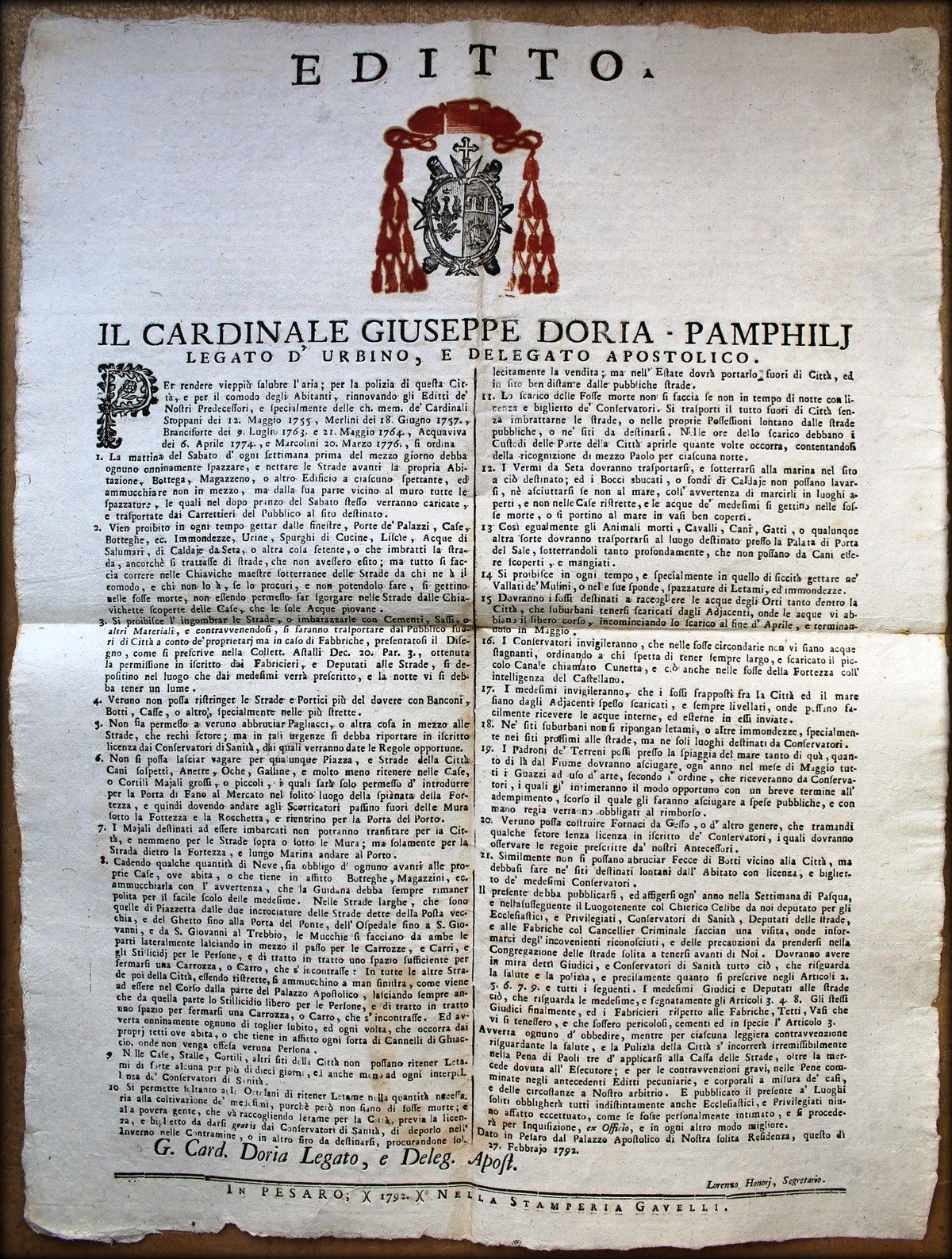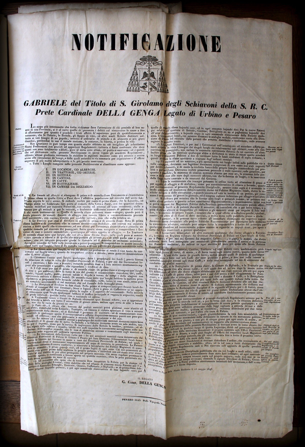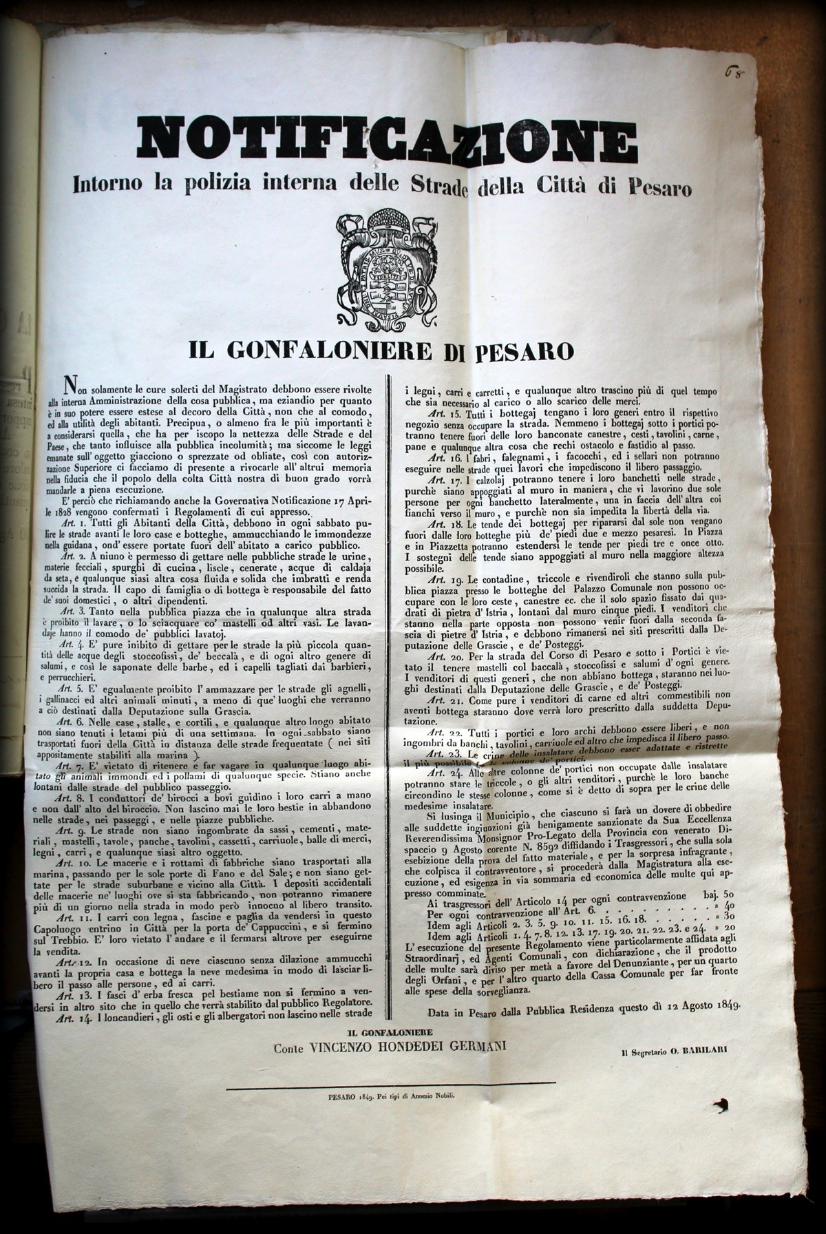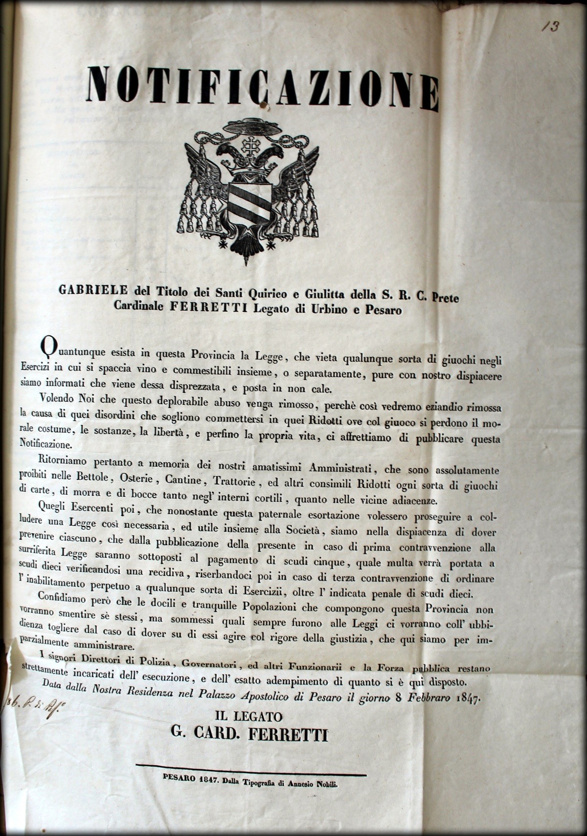 Gli amministratori sono particolarmente impegnati a regolamentare tali attività, come è testimoniato dalle notificazioni firmate dal cardinal Ferretti relative alle sanzioni previste per i commercianti che non rispettano le regole utili alla sicurezza dei cittadini; soprattutto l’attenzione va al gioco, che viene bandito da ogni attività commerciale, testimoniando dunque un problema da affrontare. Ancora più interessante il bando che regolamenta la vita di ogni abitante: che invita a pulire il tratto davanti alla propria abitazione o a non intralciare la strada con animali o oggetti propri.