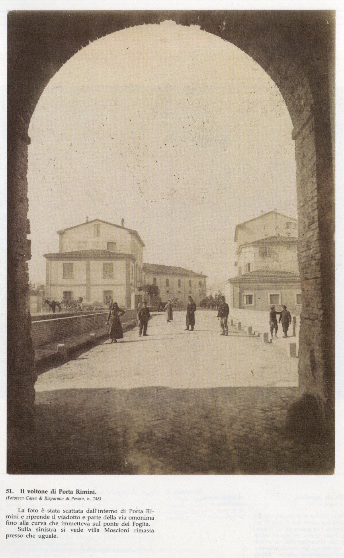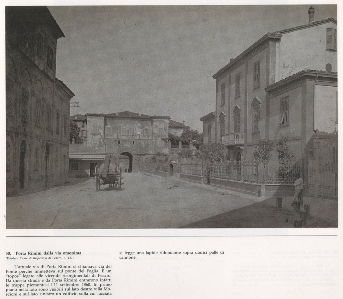 In realtà bisogna ricordare che da porta Rimini entrarono le truppe piemontesi per liberare Pesaro dal governo papalino l’11 settembre del 1860. Appena fuori della porta, di fronte a villa Moscioni, rimasta quasi identica, c’è ancora oggi una casa che ha una lapide e dodici palle di cannone. Curioso che ad aprire la porta alle truppe piemontesi furono i medici dell’ospedale San Benedetto.