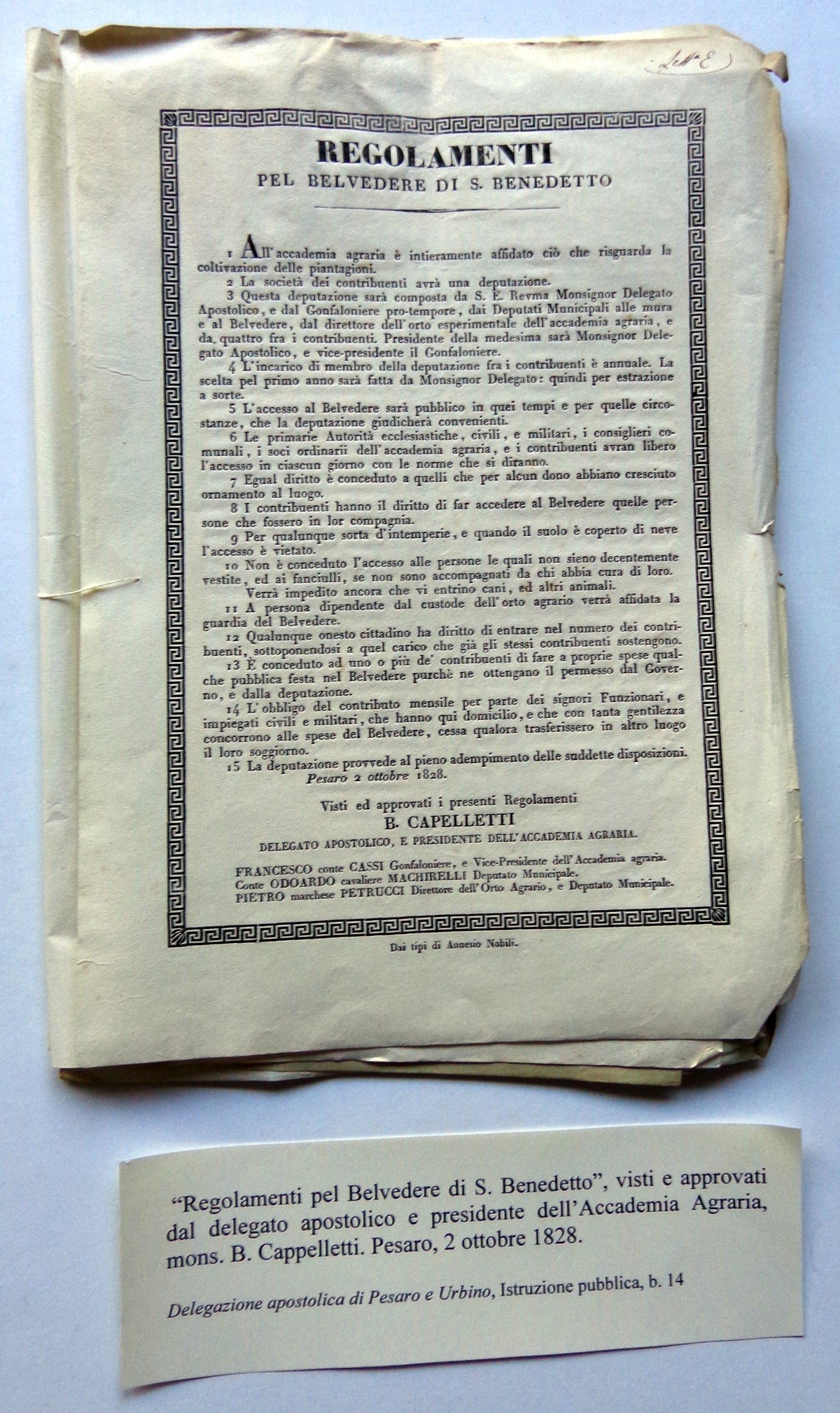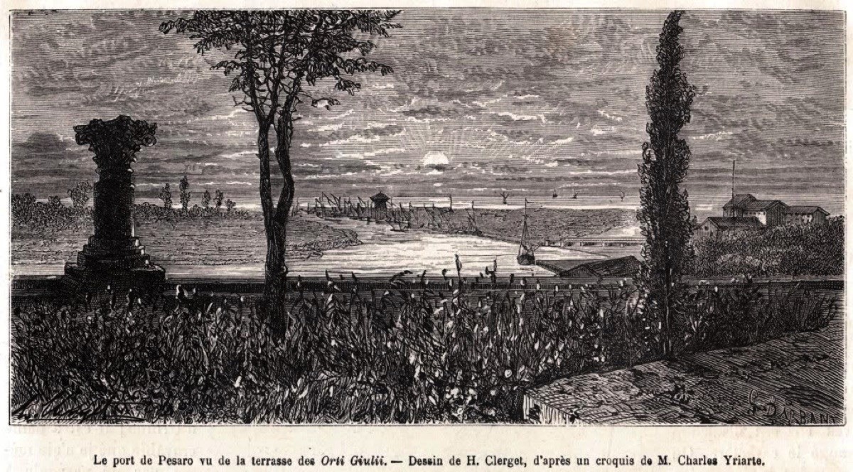 “Su un poggio poco fuori della città si trova la Villa Imperiale…partimmo un pomeriggio per vedere le meraviglie dell’ Imperiale. Lasciammo la città attraverso un imponente portale delle mura con le quali Genga aveva contornato la città e superammo il fiumiciattolo che dà luogo al porto di Pesaro. Alla porta un daziere ci fece sbagliare strada e invece di girare subito a destra seguimmo la via di Rimini e dovemmo effettuare una lunga deviazione per sentieri scoscesi e fangosi attorno a Villa Vittoria, dove aveva risieduto l’infelice regina Carolina d’Inghilterra. Da codeste alture si avevano gradevoli vedute verso l’interno dove si levano, l’una appresso all’altra, oltre la pianura, le quinte degli appennini color porpora e violetto.
