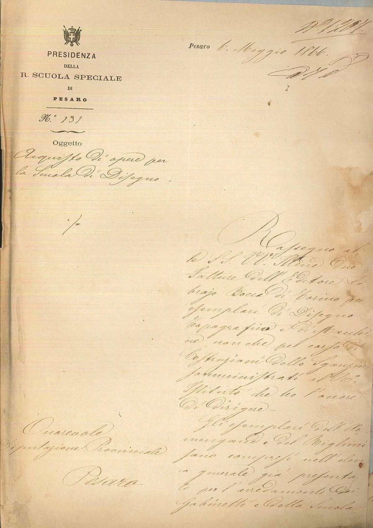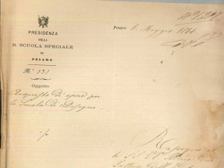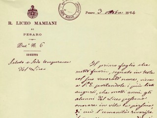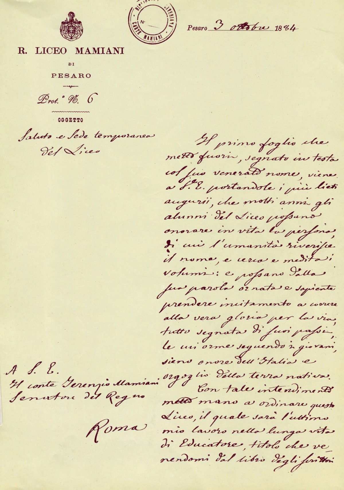 Per quanto riguarda il ginnasio, il preside Efisio Contini scrive: “ Fin qui per essere temporanea è decente. Bella e larga scala, nobilissima la palestra ginnastica, edificata per la chiesa dal Vanvitelli, una sala spaziosa, piccole ma sfogate le altre, corridojo vasto e di bella vista. (…) Se si desse tutto al Liceo e al Ginnasio, sarebbe buono anco per sede stabile; tanto più che sarebbe  nella stessa piazza del Palazzo Machirelli, e farebbe riscontro alla nuova sede del Liceo Rossini. Sarebbero in tal guisa nella stessa piazza i due Istituti che rendono più umani gli uomini, se al cuore più che alla mente volgono loro arte: e i giovani del Liceo Mamiani, nell’ora di ricreazione, tra l’una e l’altra lezione, potrebbero comodamente occuparsi di musica nel Liceo Rossini”.
