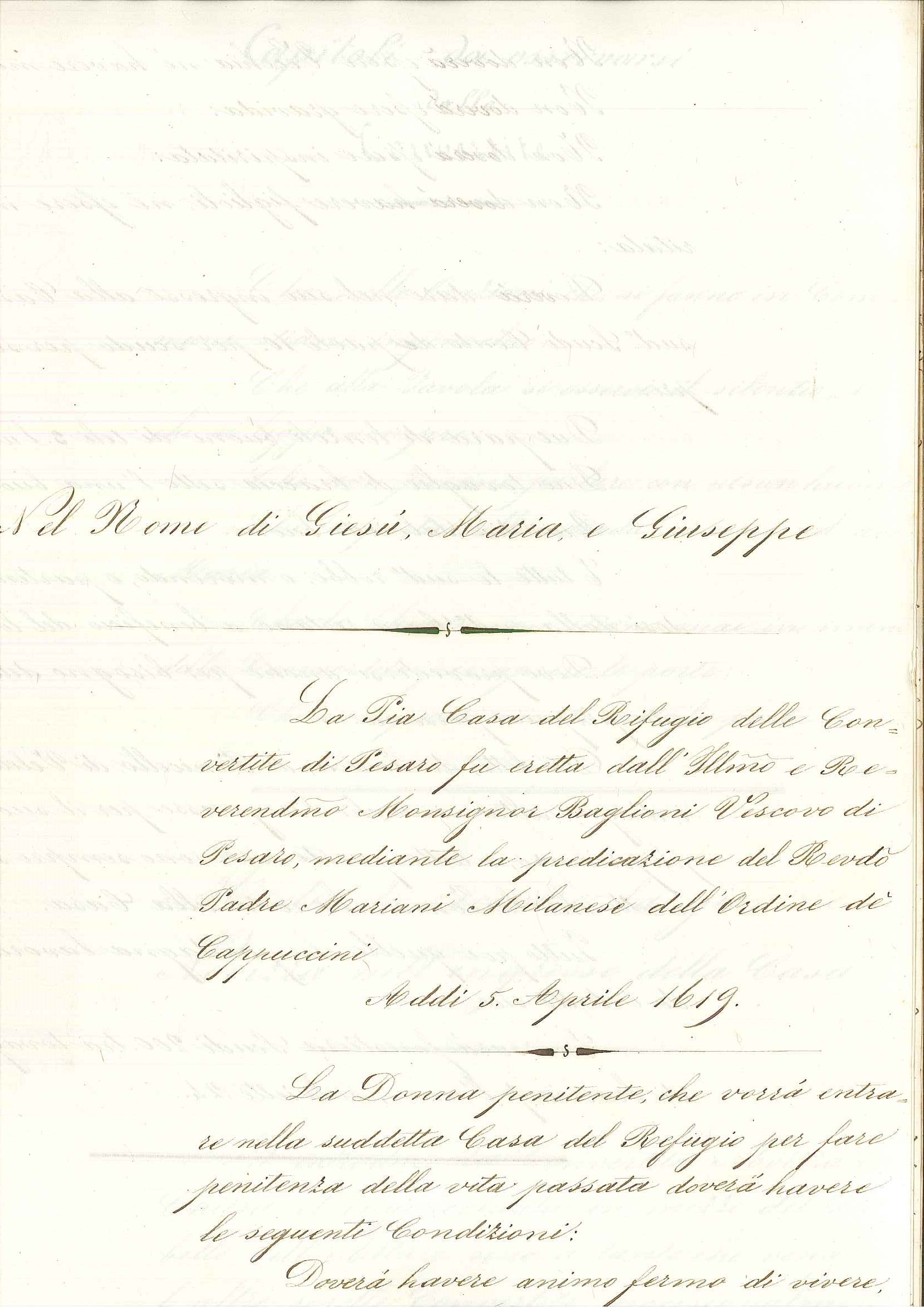 Frate Giuseppe Maria Luvini, vescovo di Pesaro, con lo scopo di eliminare gli abusi degli "stranieri" che si introducono nel pio luogo delle Convertite, proibisce a chiunque di entrare nell'istituto e che dovrà osservarsi la clausura episcopale. Stabilì inoltre: che ciascuna donna, compresa la fattora, avesse a disposizione nel magazzino due sacchi di grano, dalla cantina cinque dame di vino e una quantità di olio che bastasse al loro bisogno. Raccomandava infine il rettore e il confessore di far rispettare la regola alle donne penitenti, obbligate a restare nel Conservatorio. Fuori casa invece erano obbligate a coprirsi il capo, con il fazzoletto distintivo di panno, o velo bianco.