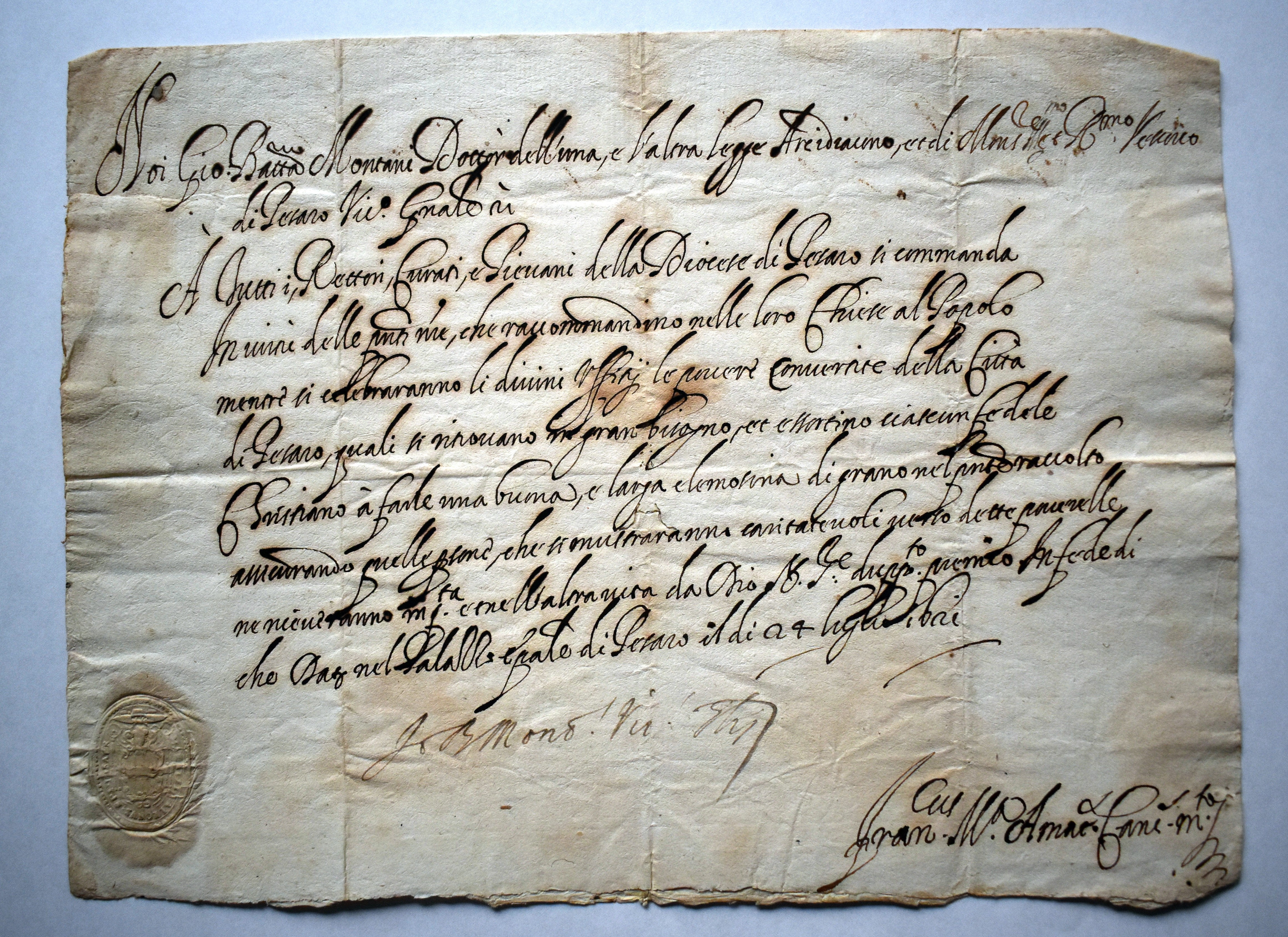 Giovanni Battista Montani, vicario generale e arcidiacono del vescovo di Pesaro, raccomanda i rettori, curati e pievani della Diocesi di Pesaro, di raccogliere le elemosine durante le celebrazioni delle messe e i divini uffici, da destinare alle Convertite della città di Pesaro "quali si ritrovano in gran bisogno, et essortino ciascun fedele e cristiano a farle una buona e larga elemosina di grano".