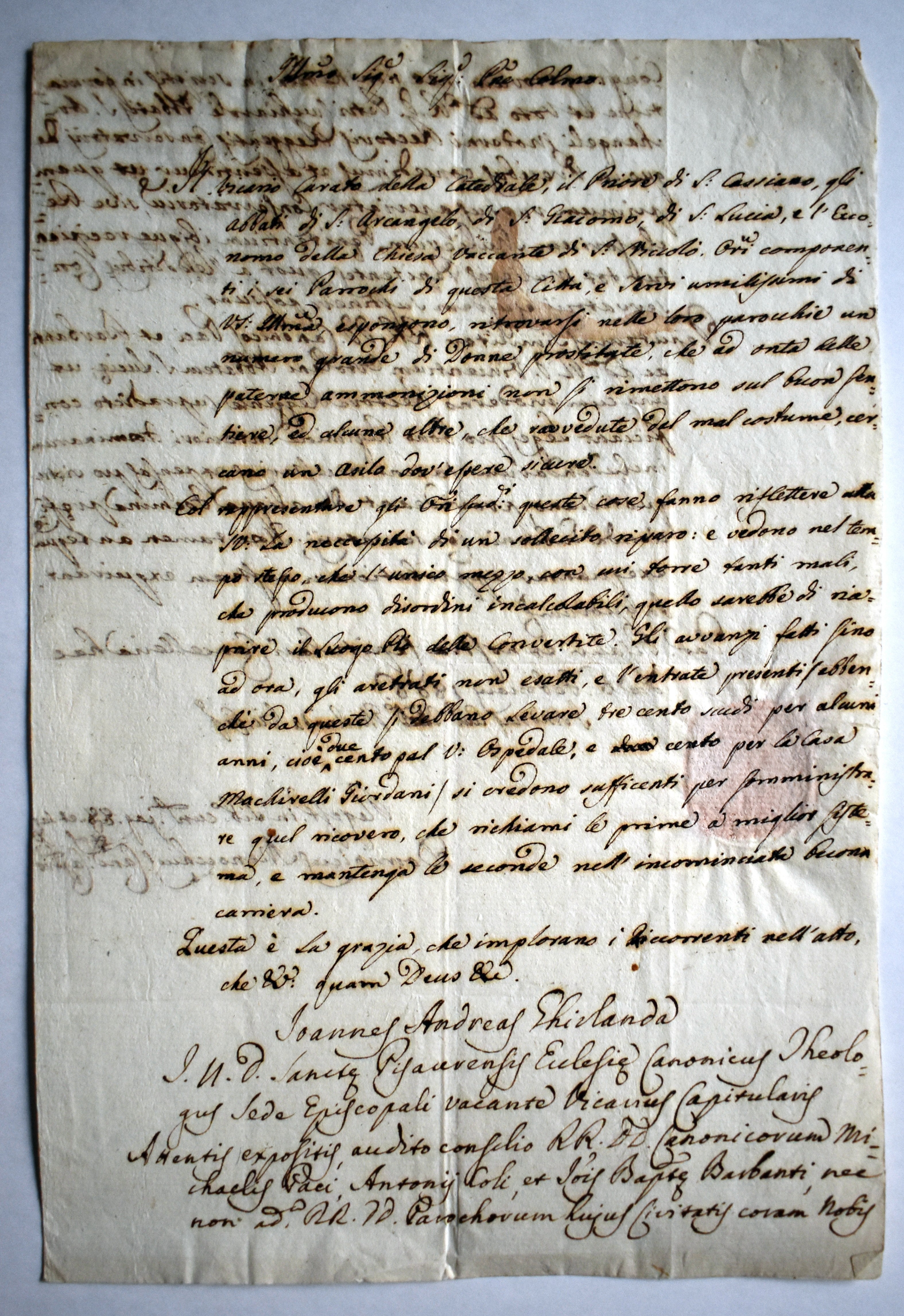 Il vicario curato della cattedrale, il priore di S. Cassiano, gli abati di S. Arcangelo, di S. Giacomo, di S. Lucia e l'economo della chiesa vacante di S. Niccolò, i sei parroci della città di Pesaro espongono che "ritrovansi nelle loro parrocchie un numero grande di donne prostitute, che ad onte delle paterne ammonizioni non si rimettono sul buon sentiero, ed altre che ravvedute dal mal costume, cercano un asilo dov'essere sicure".