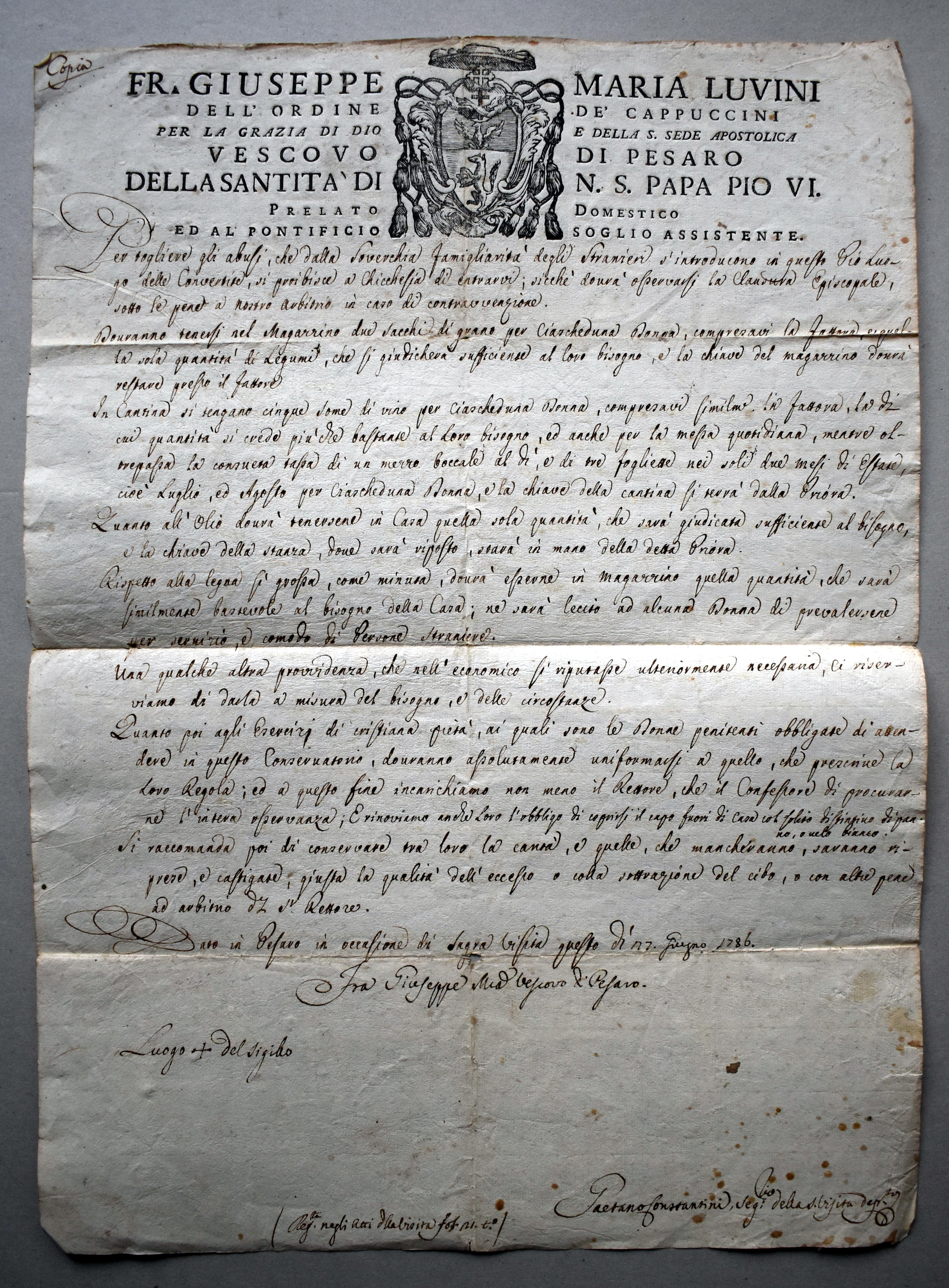 IRAB, Convertite, Busta 1520-1810, fascicolo 27, 1786, Giuseppe Maria Luvini, vescovo di Pesaro, decreta alcuni provvedimenti per il buon andamento interno della pia casa