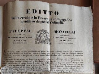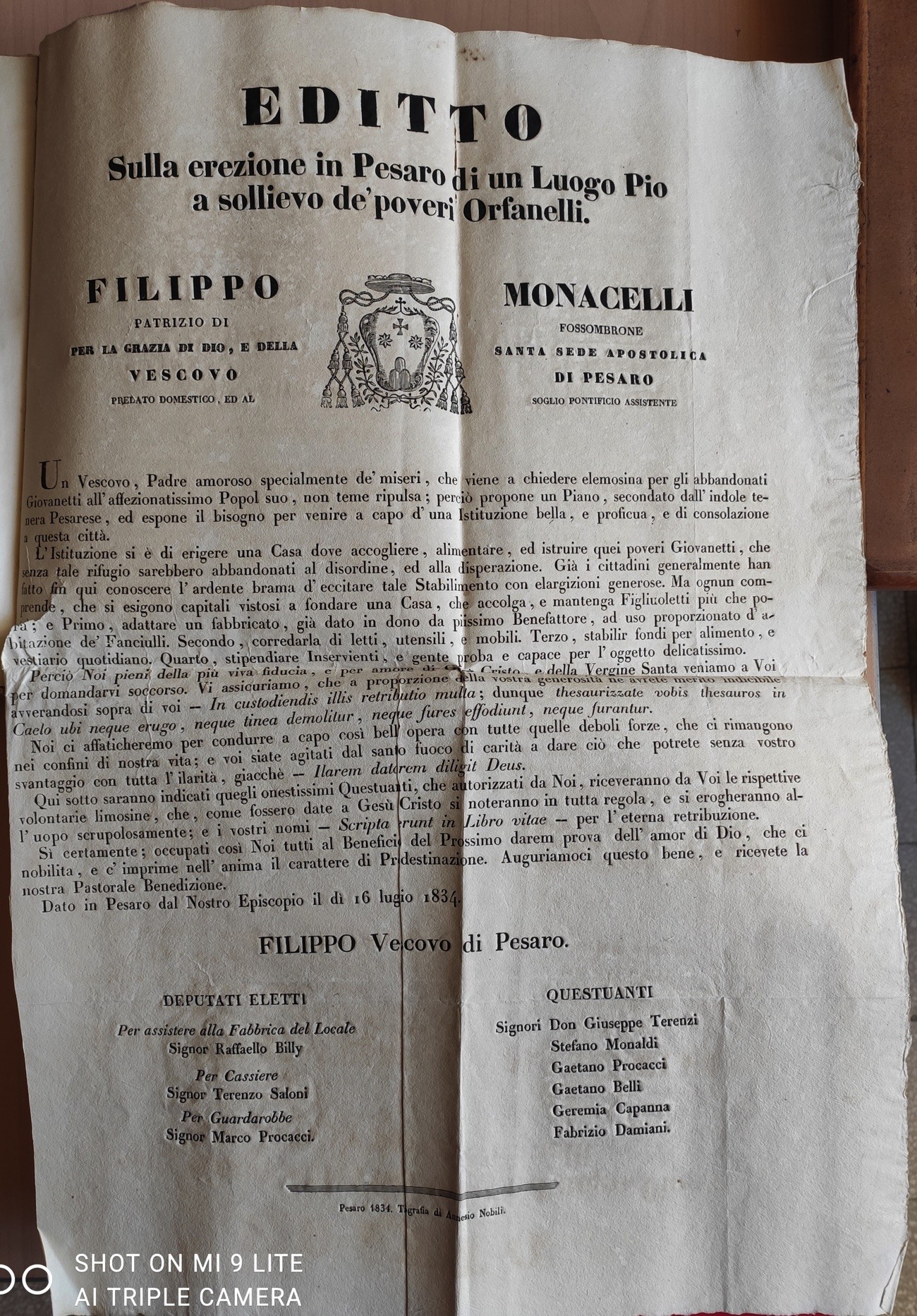 Editto sulla erezione in Pesaro di un Luogo Pio a sollievo de' poveri Orfanelli emanato dal vescovo di Pesaro, mons. Filippo Monacelli, Archivio diocesano