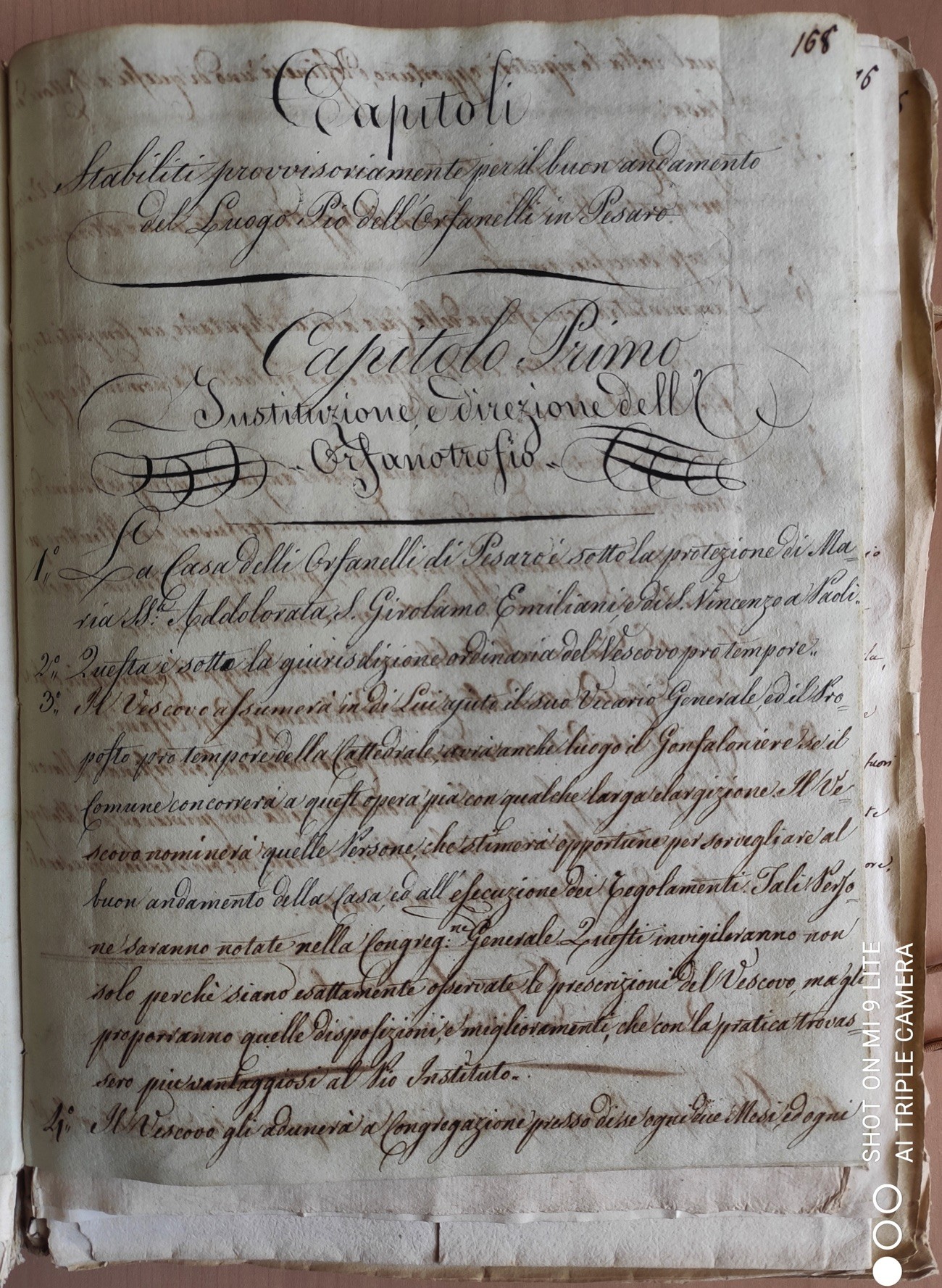 IRAB, Orfanotrofio maschile, Busta 1834-1857, fascicolo 19, Capitoli per il Conservatorio degli orfanelli di Pesaro eretto l'anno 1836, 1836