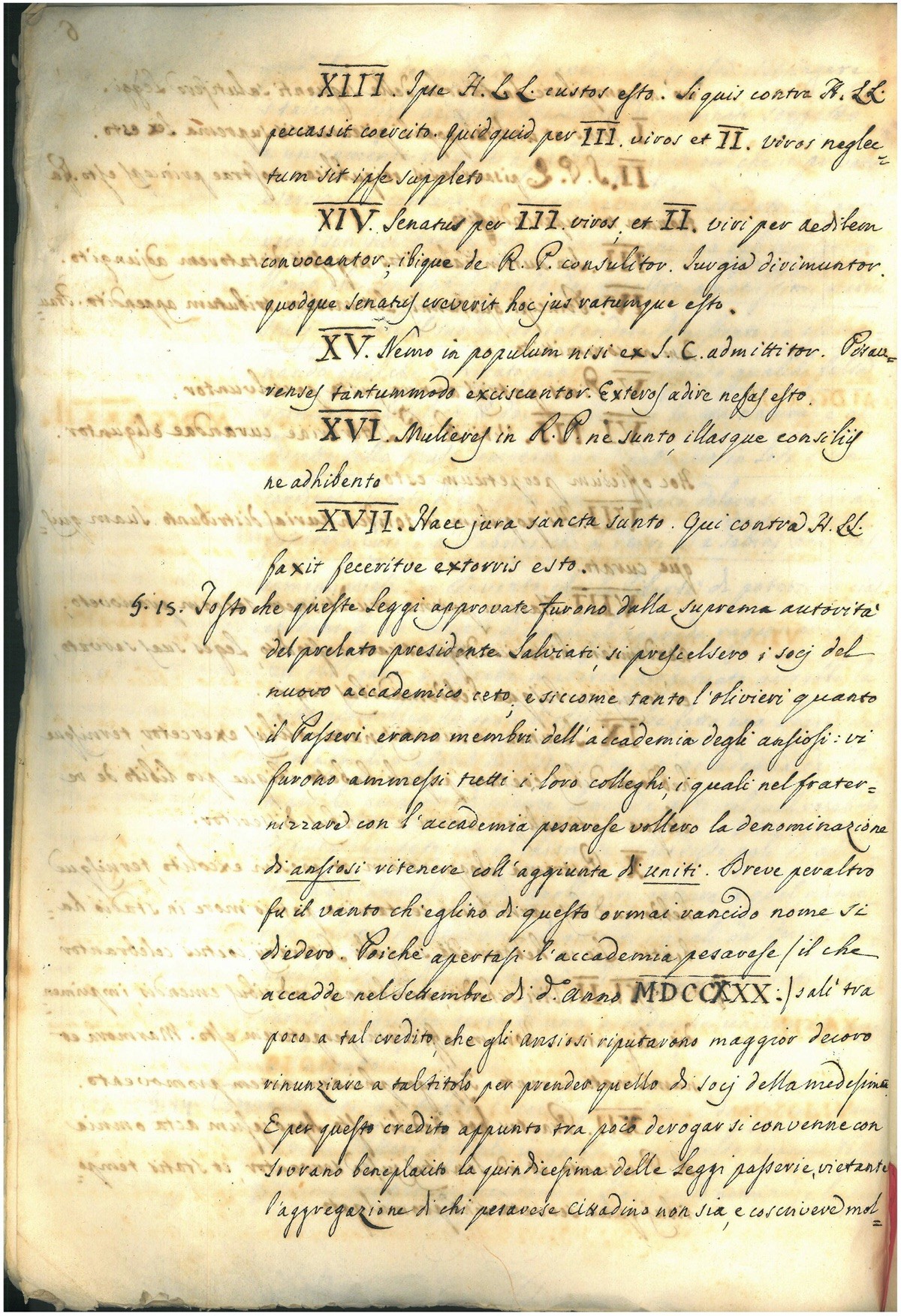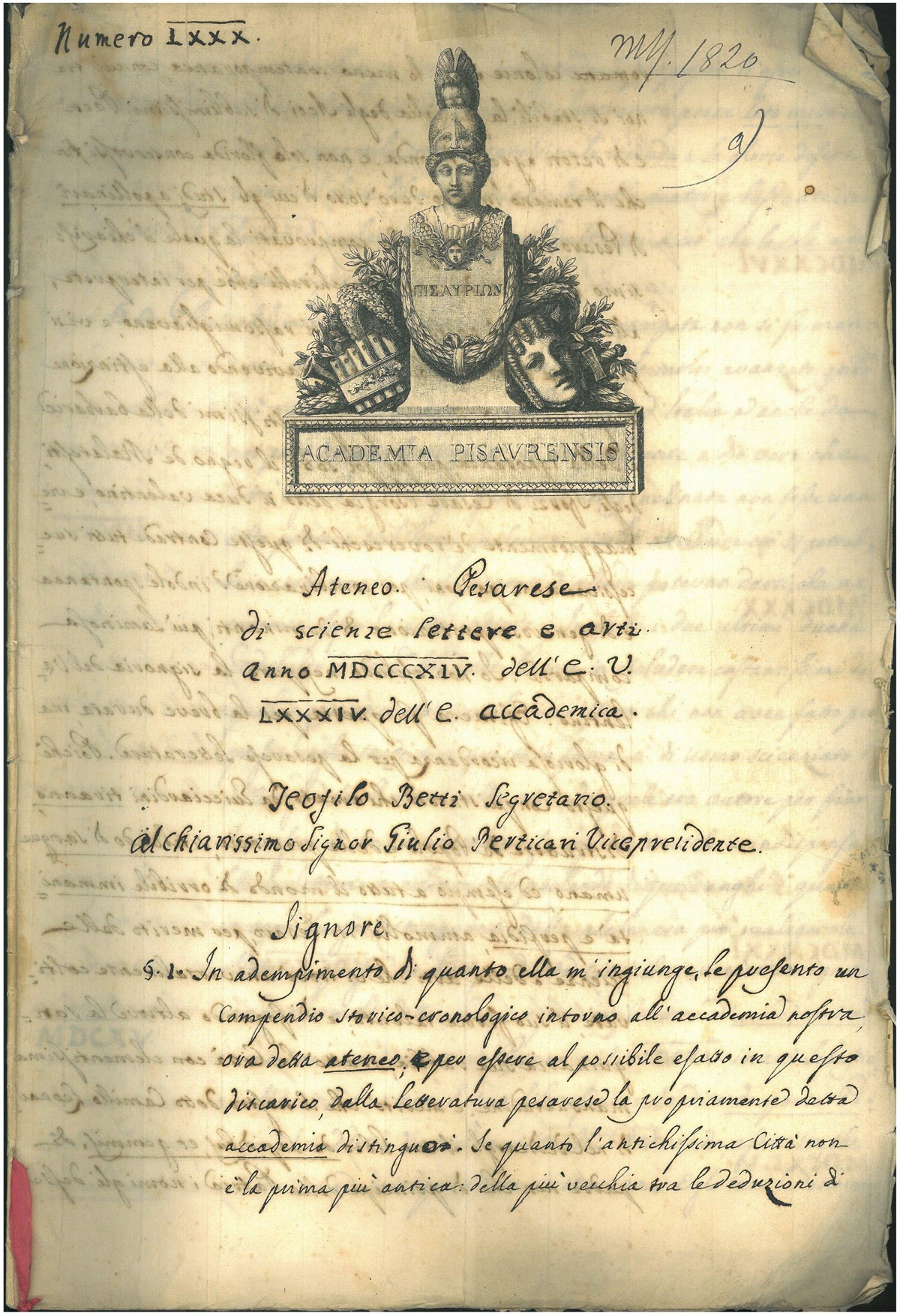 Della Accademia pesarese parla Teofilo Betti, già bibliotecario dell’Oliveriana, in un quaderno manoscritto conservato presso la Biblioteca Oliveriana. In esso vengono riportati gli statuti (sec. XIX)