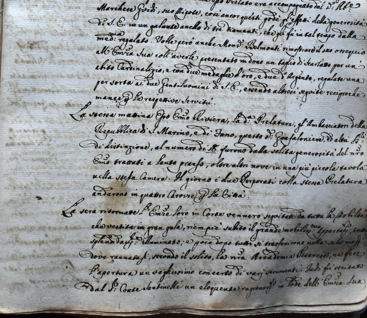 Dal Libro di memorie, in Archivio di Stato, ricordo dei festeggiamenti per la porpora cardinalizia del cardinal Lante: “Relazione di quanto è occorso in occasione di prendere la beretta cardinalizia l’em.o e r.mo signor cardinal Lante”, 1743