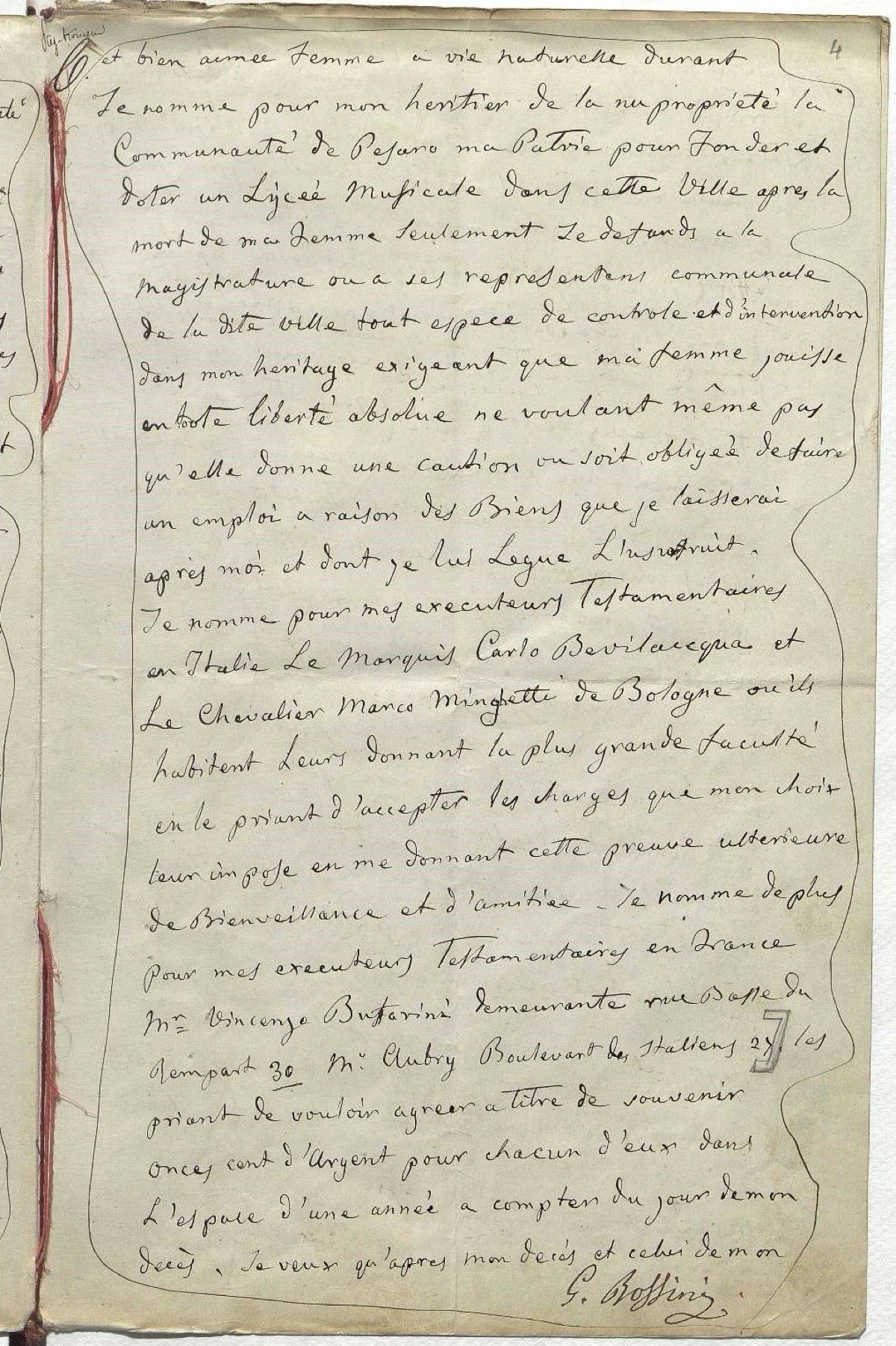 Viene mostrato un particolare del testamento originale di Gioachino Rossini in cui si parla della fondazione del Liceo musicale (apertura del testamento di G. Rossini avvenne il 14 novembre 1868, testamento del 25 luglio 1858), del not. Parigino Du Boys,conservato agli Archivi nazionali francesi.
