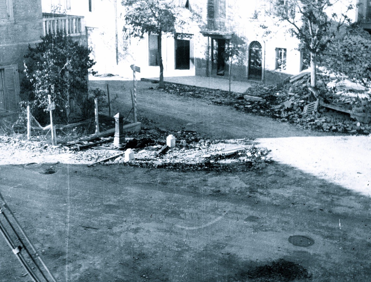 Durante la seconda guerra mondiale infatti la zona è stata luogo di scontro tra le truppe tedesche e gli alleati per liberare Pesaro; e c’è una foto storica in cui è ben visibile un cadavere a terra là dove oggi sorge la pompa di benzina e una volta c’era un piccolo spaccio e una fontanella. I palazzetti che si vedono oggi sulla sinistra testimoniano proprio i buchi dei bombardamenti e non è difficile allungare una linea retta immaginaria fino a via san Francesco, dove si è già visto che una simile sorte toccò a metà delle case della strada. Possiamo immaginare il silenzio, il suono dell’acqua, la via polverosa, la vista della città lontana e pure tanto vicina. Non lontano dalla Rocca Costanza, un’altra storia di scontro e liberazione.