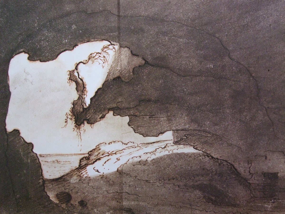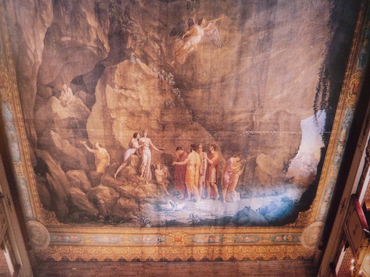 La parete ricorda molto le grotte disegnate da Romolo Liverani, che tra l’altro esistevano lungo il litorale tra Pesaro e Fano e che non si può completamente escludere che possano aver suggestionato l’immaginazione di Monticelli quando nel 1817 venne chiamato a dipingere il sipario del teatro nuovo di Pesaro: la grotta di Ippocrene dove trovano rifugio ninfe che distribuiscono acqua che è come dire cultura guardando ad una cittadina luminosa come una piccola Atene, Pesaro.
