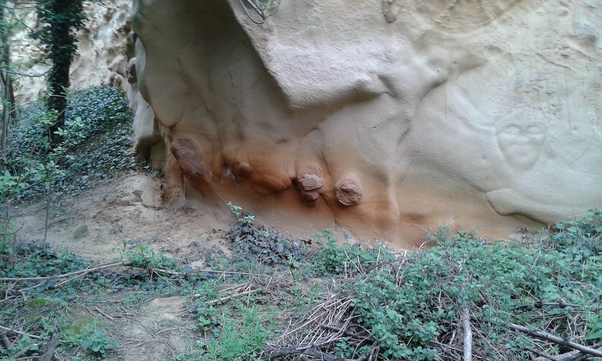 Scendendo verso via Kolbe, superata in alto la villetta di Ave Ninchi, c’è una parete di arenaria davvero suggestiva: il colore della superficie cambia a seconda delle reazioni chimiche alle condizioni metereologiche e cambia anche la sua conformazione perché si tratta di un materiale molto fragile.